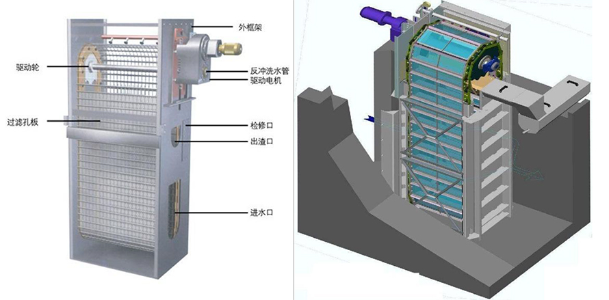 該設備主要由驅動裝置、機架、牽引鏈條、帶提升階梯的網板、沖洗系統、集渣槽及電控系統組成。帶有懸浮物的污水進入該設備,污水從格柵兩側的網板流出,木模、枝桿、毛發、纖維物等懸浮物被截流在內壁上,并隨著回轉鏈的不停運動,提升至格柵頂部。設備頂部在網板外側設有壓力沖洗裝置,該裝置不停地對頂部濾網進行沖洗,把被截流的懸浮物沖刷到設備內部的集水槽中,自流出格柵。